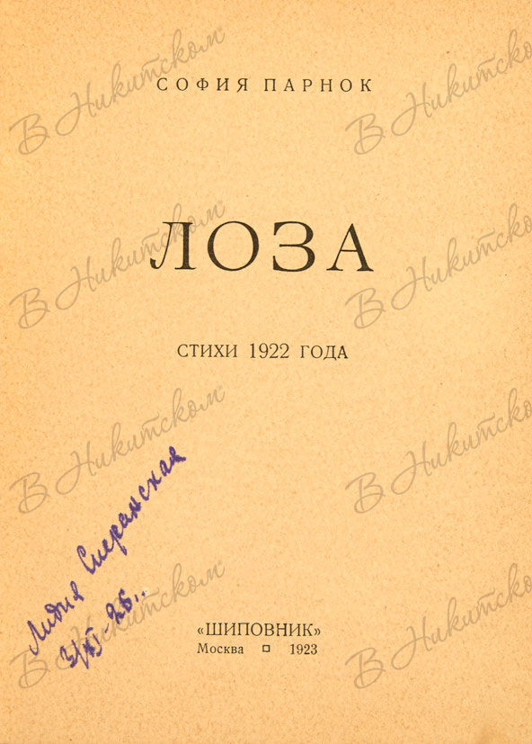 Парнок, С. Лоза. Стихи 1922 года. М.: «Шиповник», 1908.