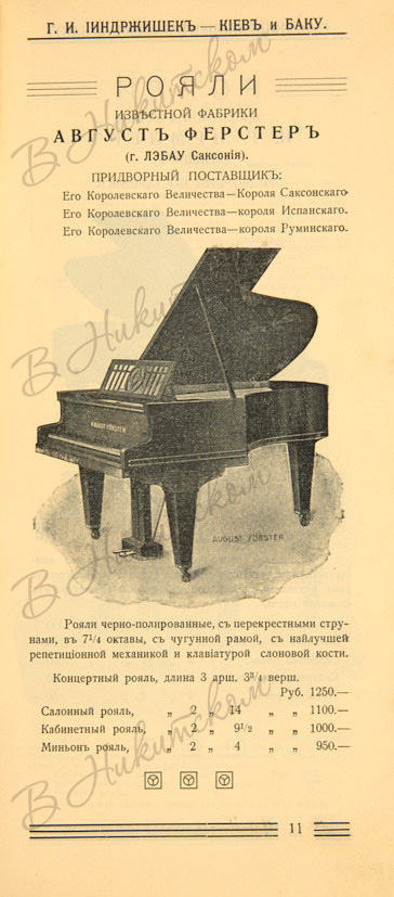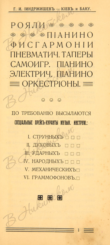 [Прейскурант магазина Г.И. Ииндржишек в Киеве]. Рояли, пианино, фисгармонии, пневматические таперы, самоиграющие пианино, электрические пианино, оркестрионы. Киев, [1910-е].