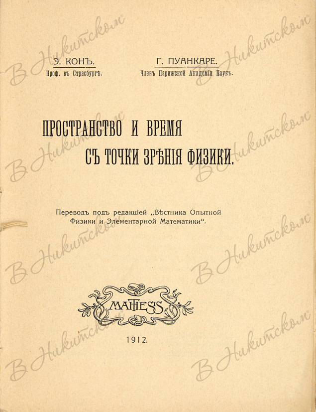 Кон, Э. Пространство и время с точки зрения физики / Э. Кон, проф. в Страсбурге, Г. Пуанкаре, чл. Париж. акад. наук; пер. под ред. "Вестника опытной физики и элементарной математики". Одесса: "Mathesis", 1912.