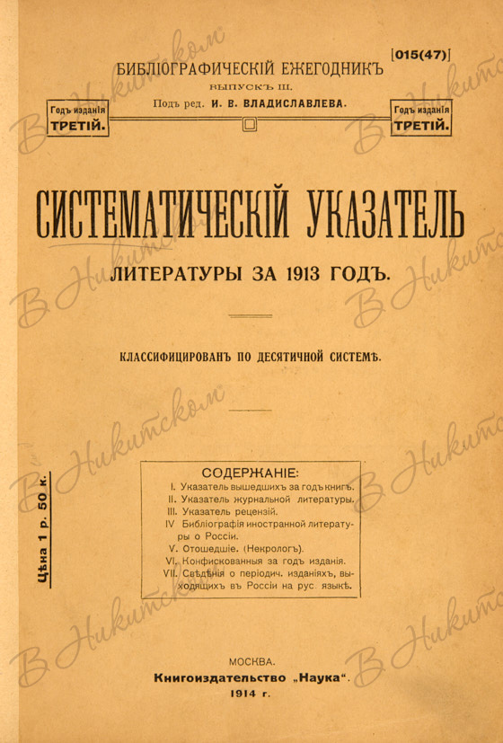 3. Систематический указатель литературы за 1913 год. (Библиографический ежегодник / под ред. И.В. Владиславлева. Вып. 3). М.: Кн-во «Наука», 1914. 369, IV с.