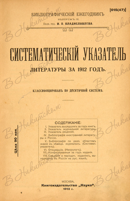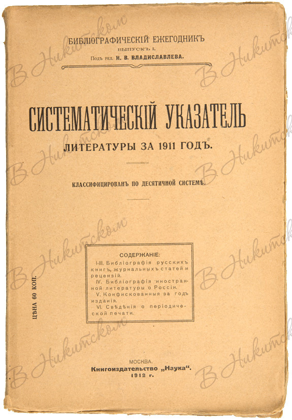 1. Систематический указатель литературы за 1911 год. (Библиографический ежегодник / под ред. И.В. Владиславлева. Вып. 1). М.: Кн-во «Наука», 1912. [2], 207, XXXII с.