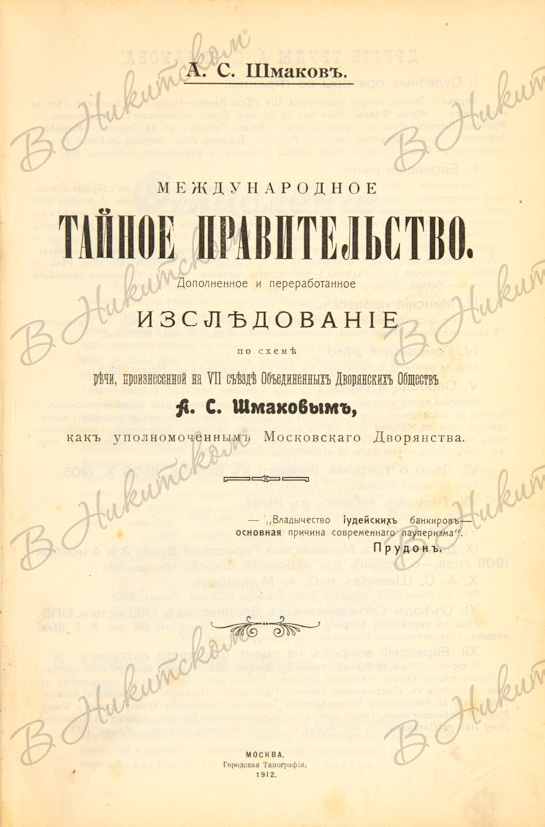 Шмаков, А.С. Международное тайное правительство. Дополненное и переработанное исследование по схеме речи, произнесённой на VII съезде Объединённых Дворянских Обществ А.С. Шмаковым, как уполномоченным московского дворянства. М.: Городская Типография, 1912.