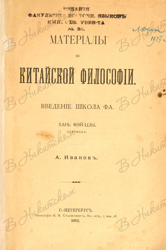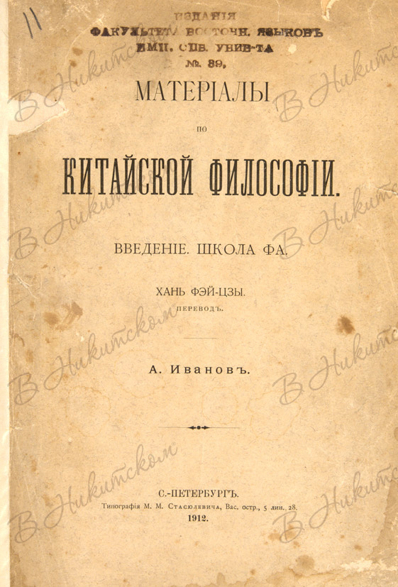 Материалы по китайской философии. Введение. Школа Фа. Хань Фэй-Цзы / пер. А. Иванова. СПб.: Тип. М.М. Стасюлевича, 1912.