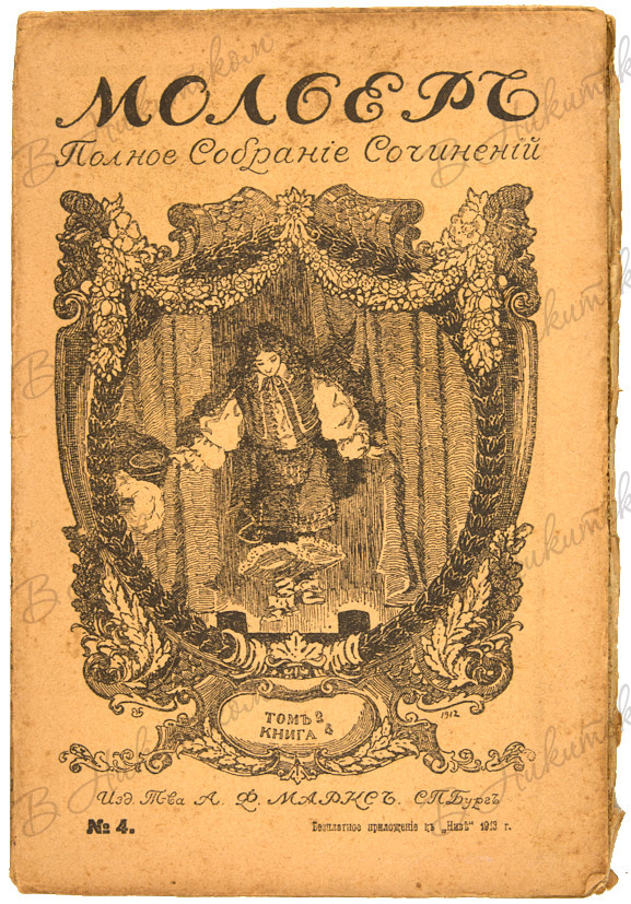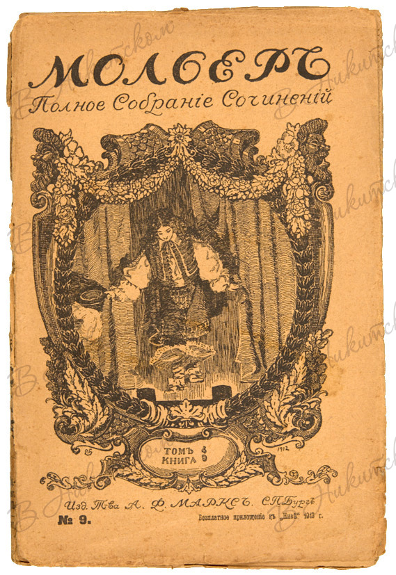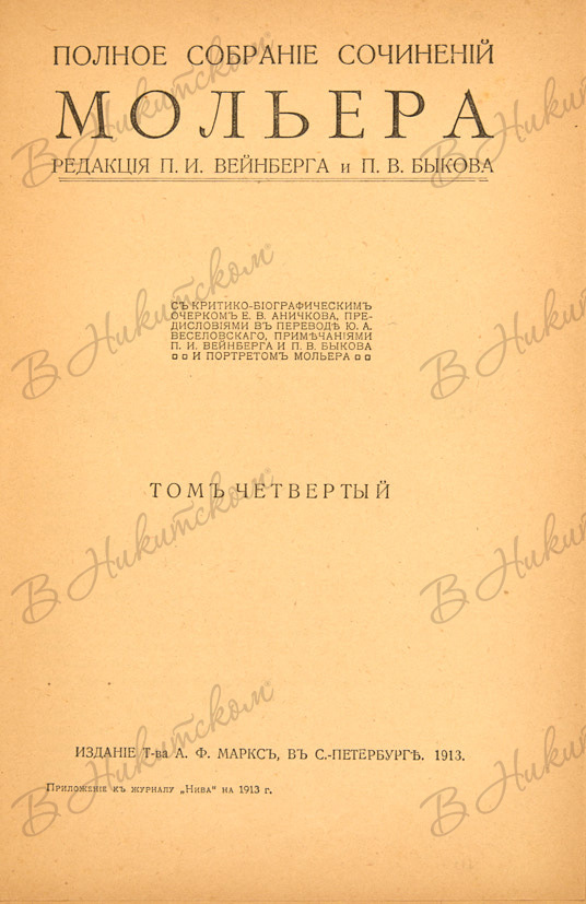 [Первое полное собрание сочинений на русском языке. Без одного тома]. Мольер. Полное собрание сочинений / Бесплатное приложение к журналу «Нива» на 1913. Под редакцией П.И. Вейнберга и П.В. Быкова, с критико-биографическим очерком Е.В. Аничкова, предисловиями в переводе Ю.А. Веселовского, примечаниями П.И. Вейнберга и П.В. Быкова и портретом Мольера. [В 10 т.]. Т. 1-5, 7-10. СПб.: Издание А.Ф. Маркс, 1913.