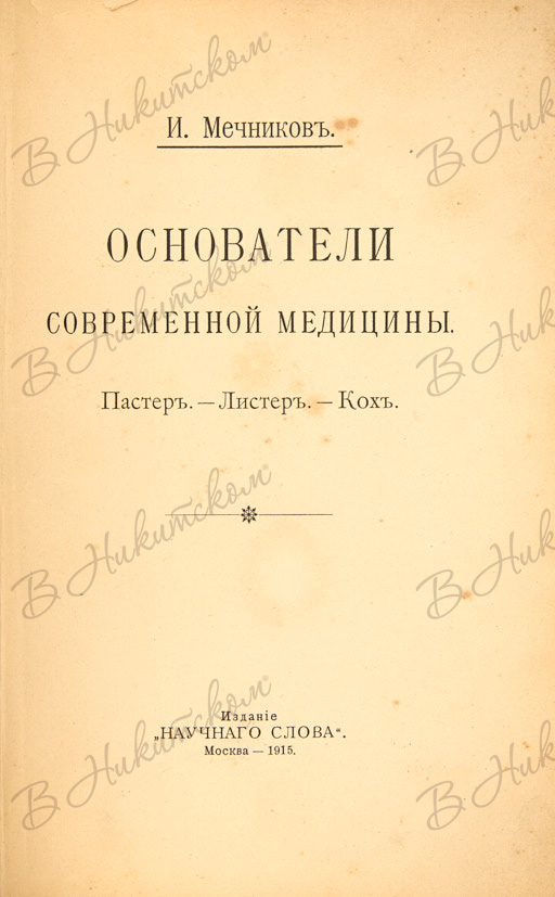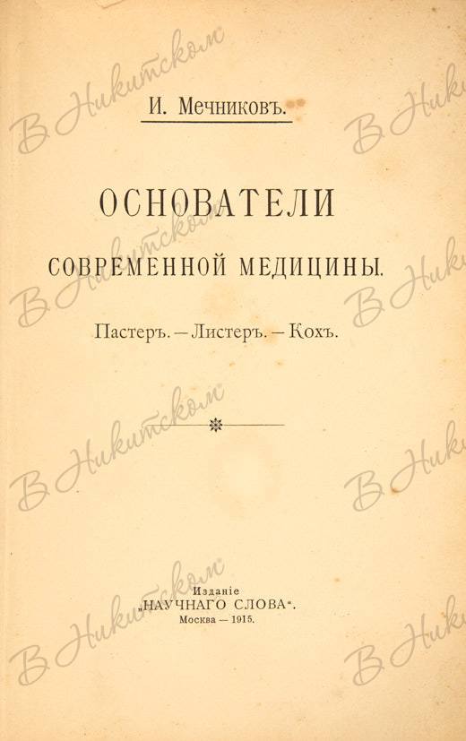 Мечников, И. Основатели современной медицины. Пастер. Листер. Кох. М.: Издание «Научное слово», 1915.