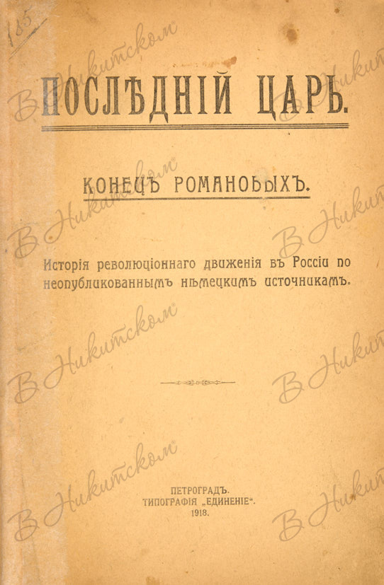 Последний царь. Конец Романовых. История революционного движения в России по неопубликованным немецким источникам. Пг.: Тип. «Единение», 1918.