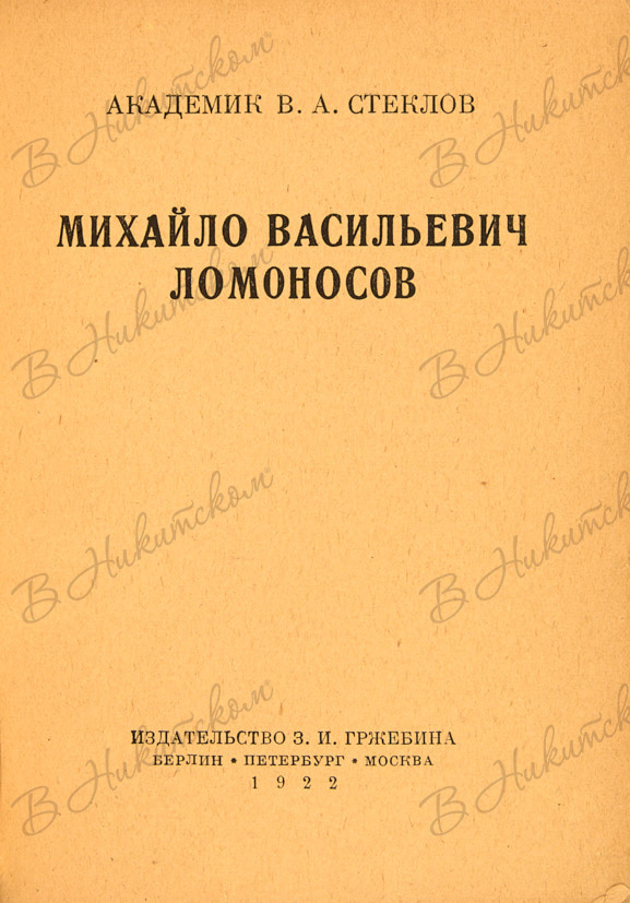 Стеклов, В.А. Михайло Васильевич Ломоносов. Берлин, Пб., М.: Изд-во З.И. Гржебина, 1922.