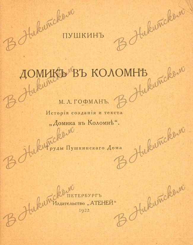 Гофман, М. Пушкин. Домик в Коломне. История создания и текста. Пб.: Издательство «Атеней», 1922.