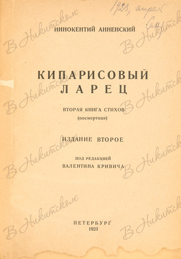 Анненский, И. Кипарисовый ларец. Вторая книга стихов (посмертная) / под ред. В. Кривича. 2-е изд. Пб.: Книгоиздательство «Картонный домик», 1923.