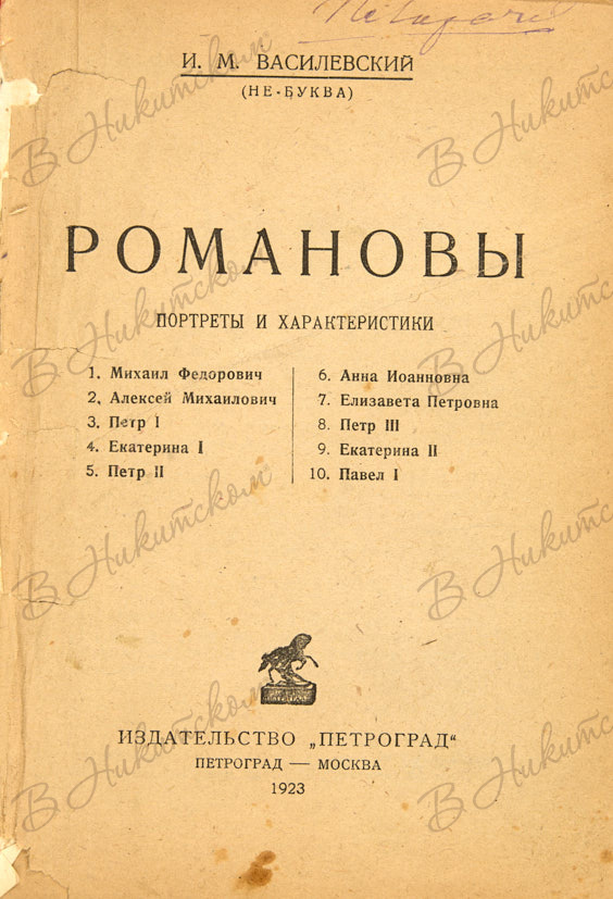 Василевский, И.М. (Не-Буква). Романовы. Портреты и характеристики. В 2 т. [Т. 1] Пг.; М.: Изд-во «Петроград», 1923.