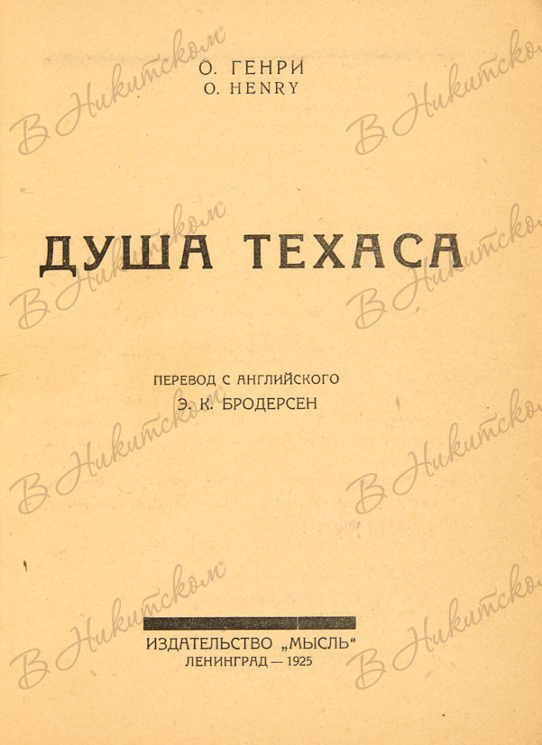 Генри, О. Душа Техаса / пер. с англ. Э.К. Бродерсен. Л.: «Мысль», 1925.