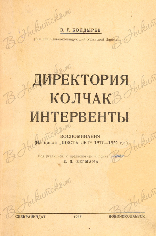 Болдырев, В. Директория. Колчак. Интервенты. Новониколаевск: Сибкрайиздат, 1925.