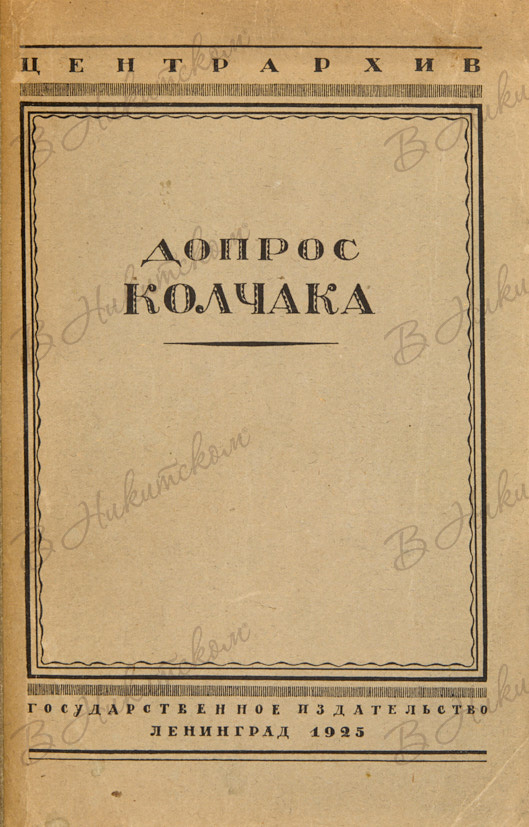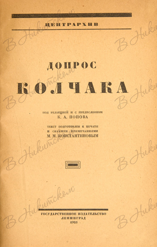 Допрос Колчака / под ред. и с пред. К.А. Попова; текст подготовлен к печати и снабжён примеч. М.М. Константиновым. Л.: Государственное издательство, 1925.
