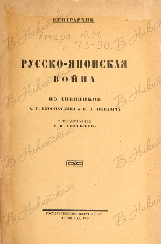 Русско-японская война. Из дневников А.Н. Куропаткина и Н.П. Линевича / с пред. М.Н. Покровского. Л.: Государственное издательство, 1925.