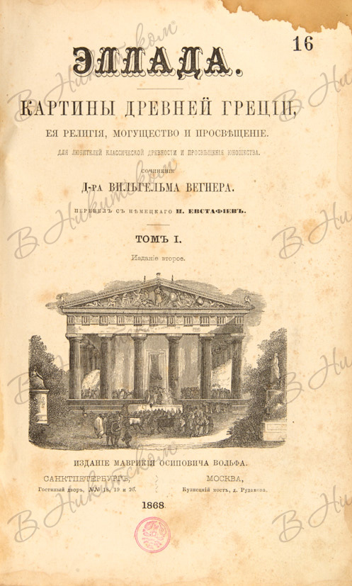 Вегнер, В. Эллада. Картины древней Греции, ее религия, могущество и просвещение. Для любителей классической древности и просвещения юношества / пер. с нем. П. Евстафиев. 2-е изд. В 2 т. Т. 1-2. СПб.; М.: М.О. Вольф, 1868.