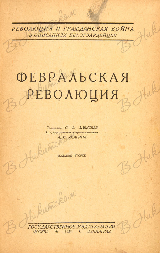 Февральская революция / сост. С.А. Алексеев, с предисл. и примеч. А.И. Усагина. (Революция и гражданская война в описании белогвардейцев). 2-е изд. М.; Л.: Государственное издательство, 1926.
