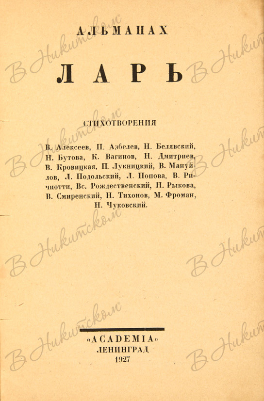 Альманах Ларь. Стихотворения. Л.: Academia, 1927.