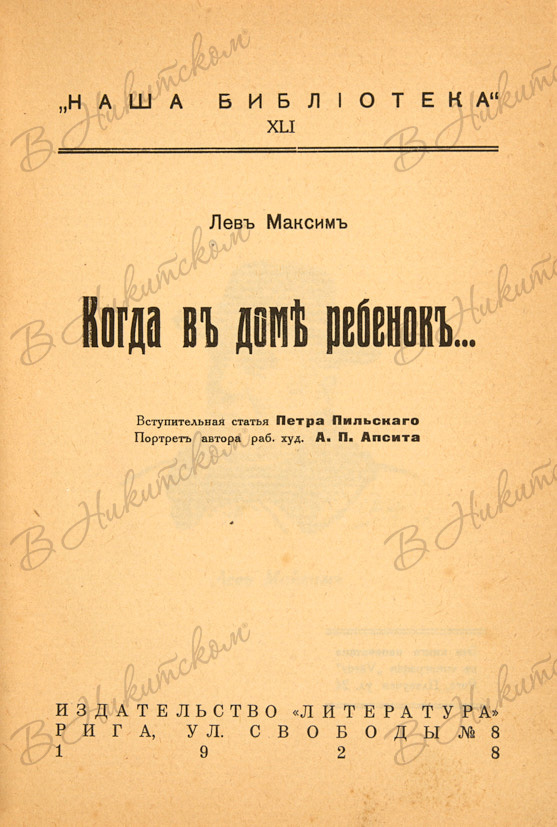 Максим, Л. Когда в доме ребёнок. Рига: Издательство «Литература», 1928.