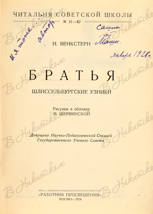 Венкстерн, Н. [Автограф]. Братья. Шлиссельбургские узники / рис. и обл. М. Шервинской [Автограф]. М.: Работник просвещения, 1928.