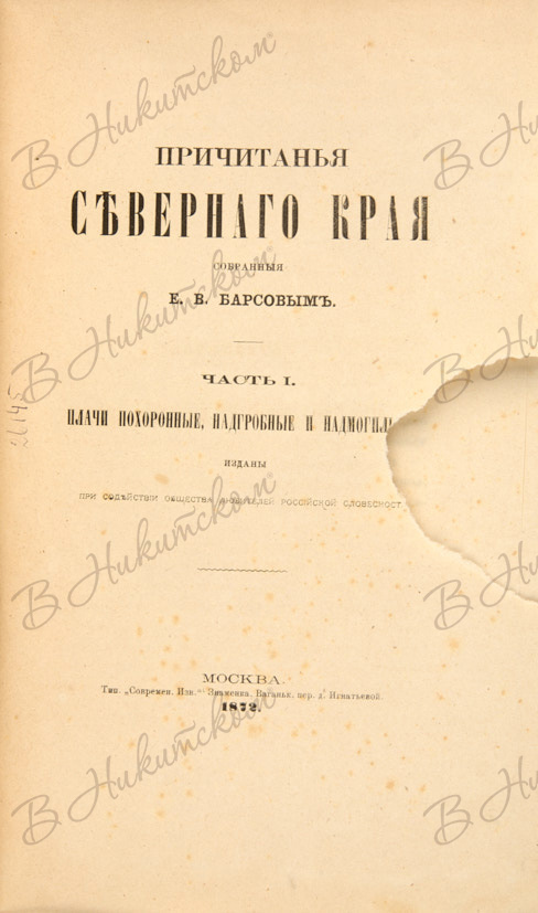 [Барсов, Е.В. Автограф]. Причитанья северного края, собранные Е.В. Барсовым. Ч. 1. М.: Тип. «Совр. Изв.», 1872.
