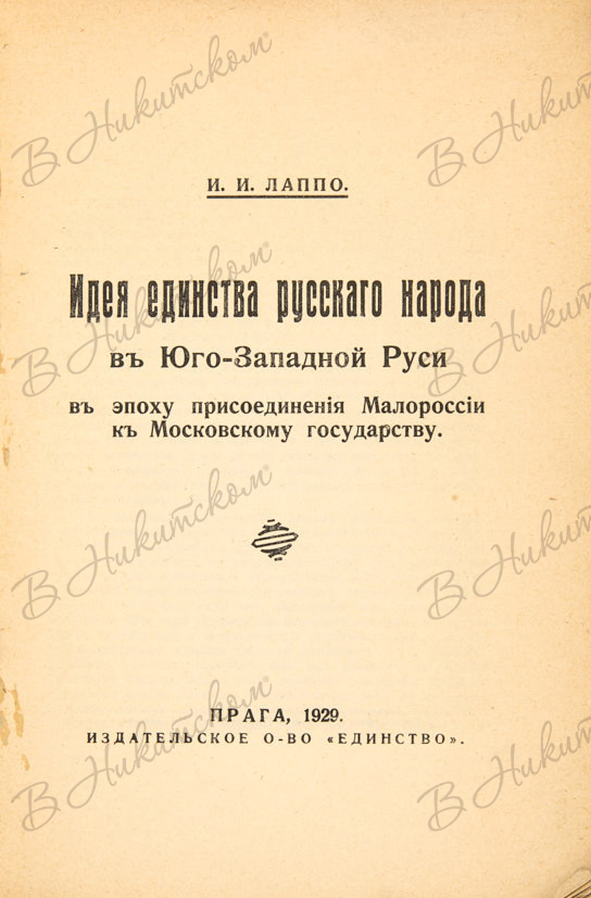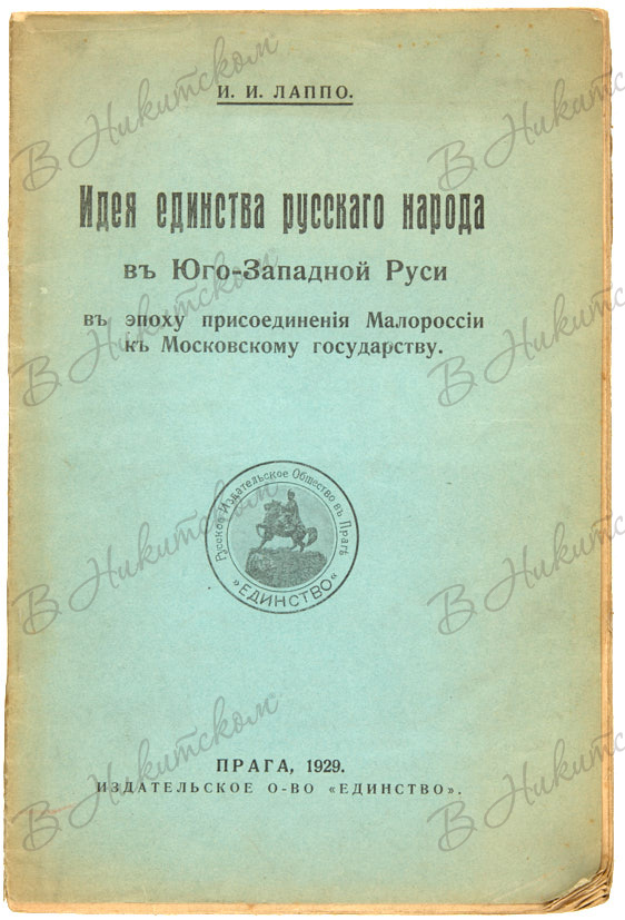 Лаппо, И.И. Идея единства русского народа в Юго-Западной Руси в эпоху присоединения Малороссии к Московскому государству. Прага: Издательское О-во «Единство», 1929.