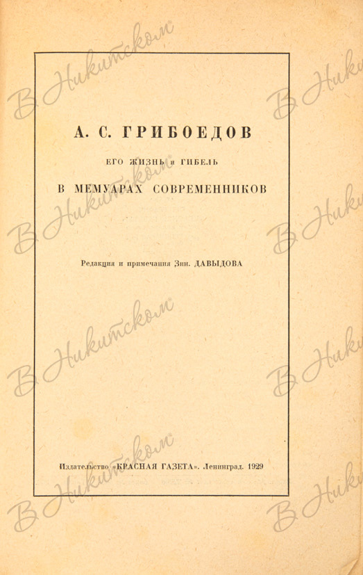 А.С. Грибоедов. Его жизнь жизнь и гибель. В мемуарах современников / Редакция и примеч. Зин. Давыдова. Л.: Издательство «Красная газета», 1929.