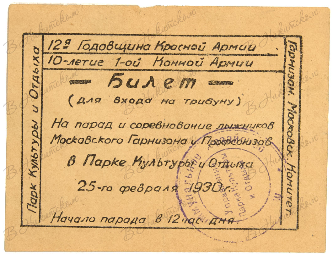 Билет для входа на парад и соревнование лыжников Московского Гарнизона и Профсоюзов в Парке Культуры и Отдыха. 25 февраля 1930.
