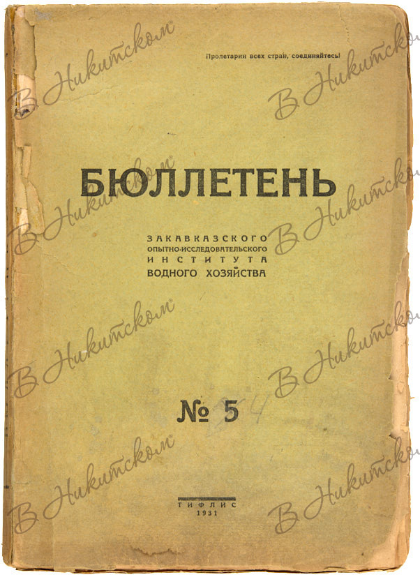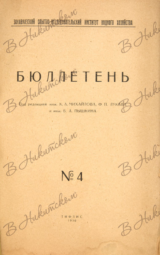 Бюллетень Закавказского опытно-исследовательского института водного хозяйства. № 4 (на обложке № 5) / Под ред. инж. К. А. Михайлова, Ф. П. Лукава и инж. Б. А. Пышкина. Тифлис, 1930.