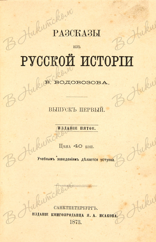[Водовозов, В.]. Рассказы из русской истории В. Водовозова. Вып. 1. Издание 5-е. СПб.: Издание книгопродавца Я.А. Исакова, 1873.