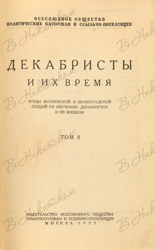 Декабристы и их время / Труды московской и ленинградской секций по изучению декабристов и их времени. [В 2 т.]. Т. 2. М.: Издание Всесоюзного Общ. политкаторжан и ссыльно-поселенцев, 1932.