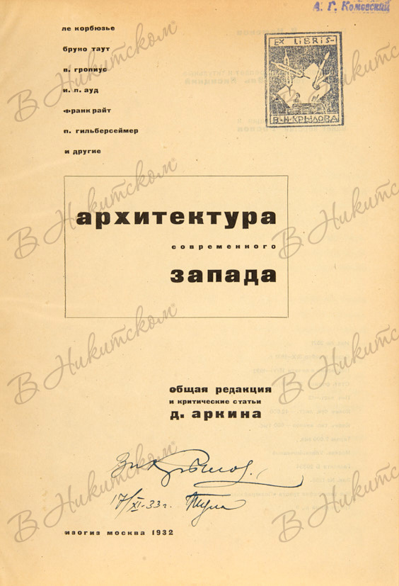 Архитектура современного Запада. [Сборник статей] / ред. Д. Аркина, оформ. Эль Лисицкого. М.: Изогиз, 1932.