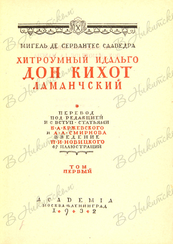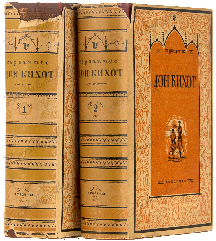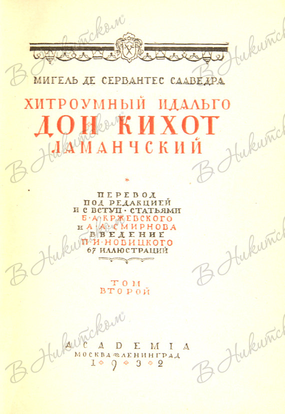 Сервантес Сааведра, М. де. Хитроумный идальго Дон Кихот Ламанчский / оформ. С.М. Пожарского, пер. под ред. и с вступ. статьями Б.А. Кржевского и А.А. Смирнова, введение П.И. Новицкого. [В 2 т.]. Т. 1-2. 2-е изд. М.; Л.: Academia, 1932.