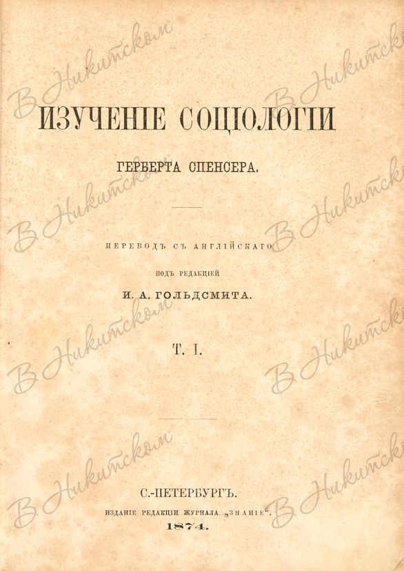 Спенсер, Г. Изучение социологии / пер. с англ. под ред. И.А. Гольдсмита. [В 2 т.] Т. 1. Издание редакции журнала «Знание», 1874.