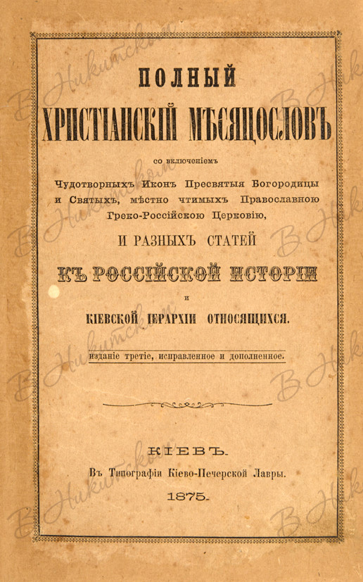 Полный христианский месяцеслов со включением чудотворных Икон Пресвятыя Богородицы и Святых, местно чтимых Православной Греко-Российской Церковью и разных статей к российской истории и Киевской Иерархии относящихся. Киев: В Типографии Киево-Печерской Лавры, 1875.