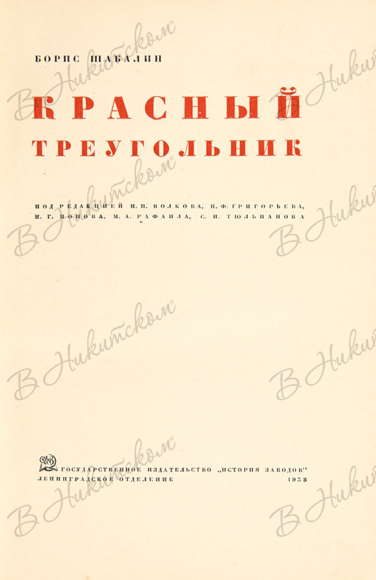 Шабалин, Б. Красный треугольник / под ред. Н.П. Волкова, И.Ф. Григорьева, Н.Г. Попова, М.А. Рафаила, С.И. Тюльпанова. Л.: Гос. изд. «История заводов», 1935.