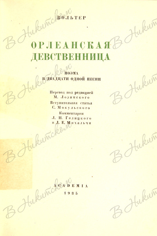 Вольтер. Орлеанская девственница / пер. под ред. М. Лозинского, вступ. ст. С. Мокульского, комм. Л.Н. Галицкого и Д.Е. Михальчи. М.; Л.: Academia, 1935.
