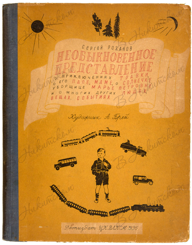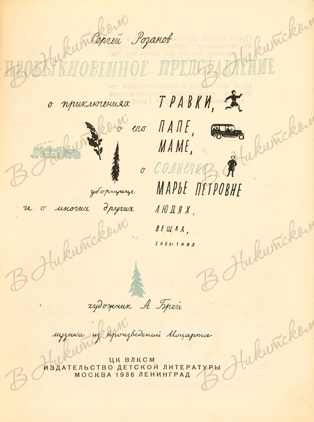 Розанов, С. Необыкновенное представление о приключениях Травки, о его папе, маме, о Солнечке, уборщице Марье Петровне и о многих других людях, вещах, событиях / худ. А. Брей; музыка из произведений Моцарта. М.; Л.: ДЕТИЗДАТ, 1936.