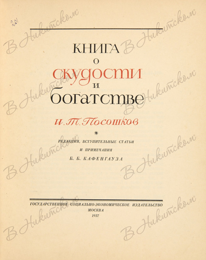 Посошков, И.Т. Книга о скудости и богатстве / редакция, вступ. статьи и прим. Б.Б. Кафенгауза.