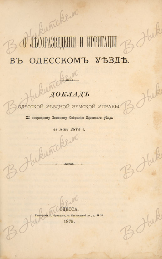 О лесоразведении и ирригации в Одесском уезде. Доклад Одесской уездной земской управы. Одесса: Тип. П. Францова, 1875.