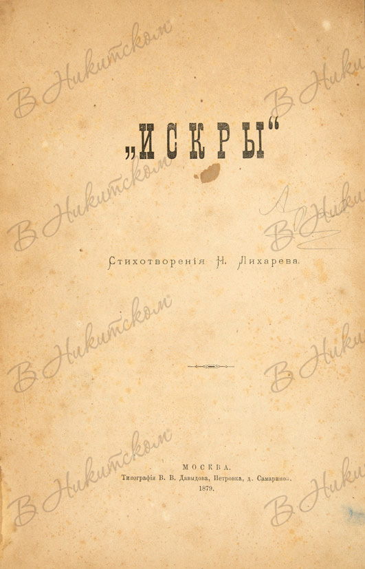 Лихарев, Н. Искры. Стихотворения. М.: Типография В.В. Давыдова, 1879.