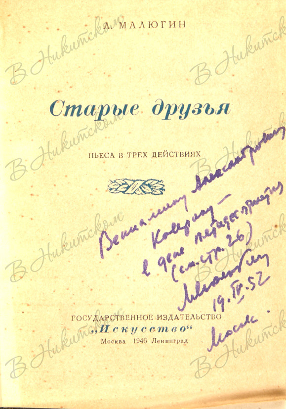Малюгин, Л. [Автограф]. Старые друзья. М.; Л.: Искусство, 1946.