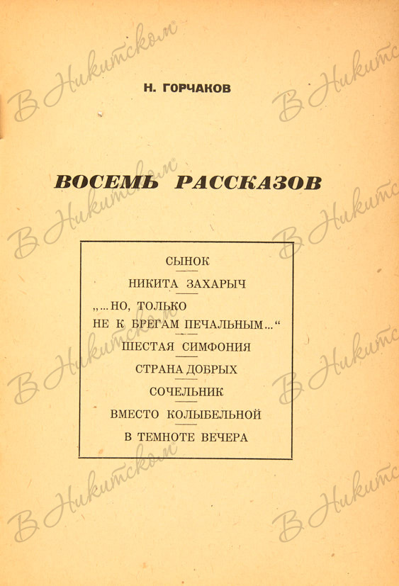 Горчаков, Н. Восемь рассказов. Мюнхен: Издательство «Златоуст», 1948.