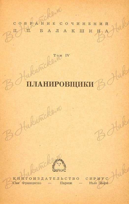 Балакшин, П. Планировщики. [Собрание сочинений. Т. 4]. Сан-Франциско; Париж; Нью-Йорк: Книгоиздательство «Сириус», 1955.