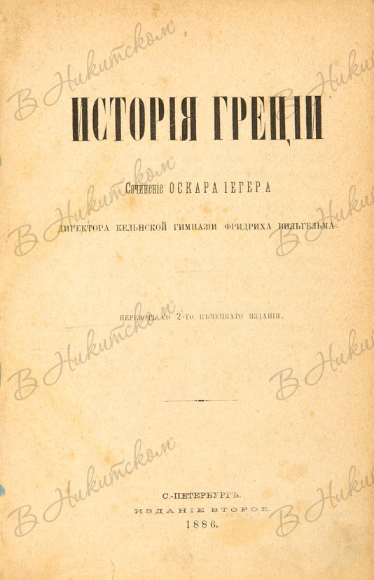 Иегер, О. История Греции / пер. со 2-го нем. изд. [В 2 ч. Ч. 1-2]. 2-е изд. СПб.: Тип. и лит. «Русская скоропечатня» (Э.К. Корево), 1886.