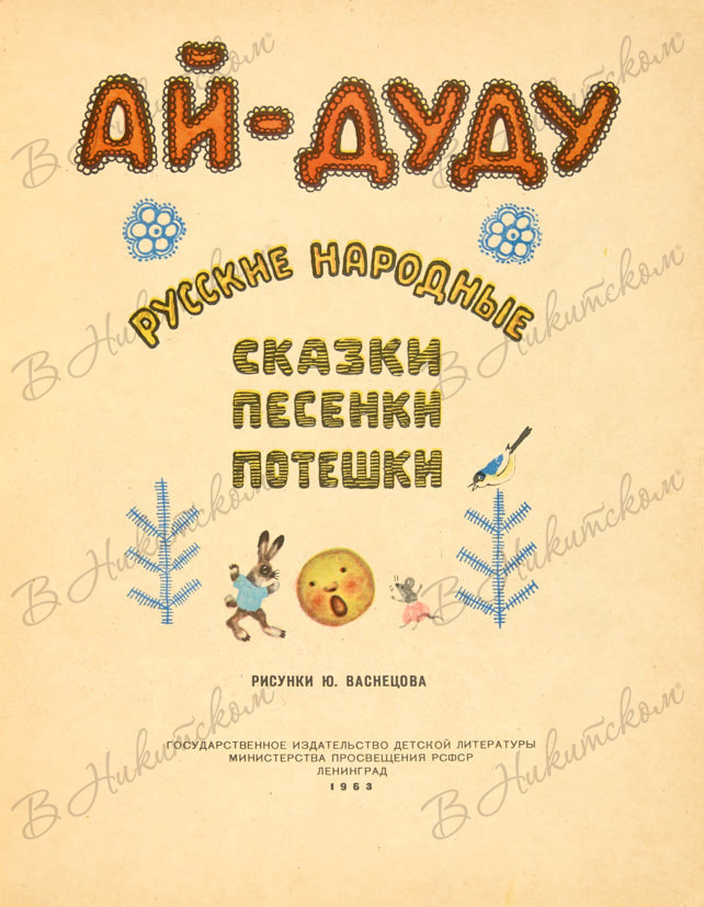 Ай-Дуду. Русские народные сказки, песенки, потешки / рис. Ю. Васнецова. Л.: ДЕТГИЗ, 1963.