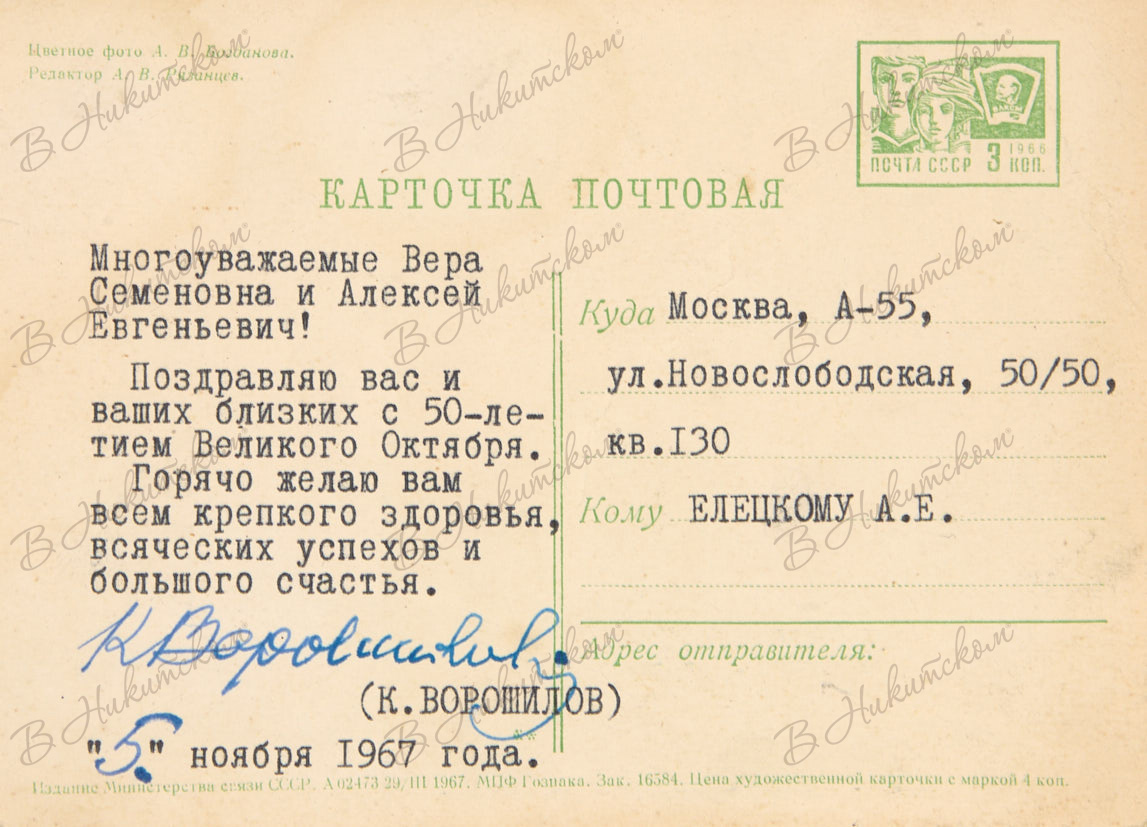 Ворошилов, К.Е. [Автограф]. Поздравительная открытка А.Е. Елецкому с личной подписью К. Ворошилова. 5 ноября 1967.