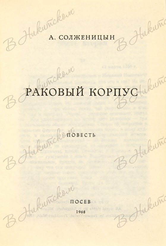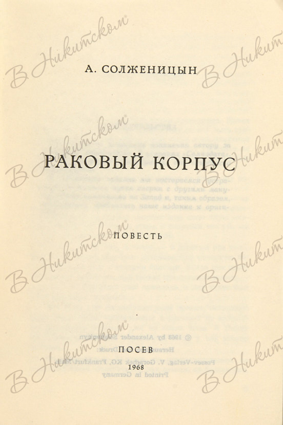[Одно из первых изданий]. Солженицын, А. Раковый корпус. Повесть. В 2 ч. Ч. 1-2. Франкфурт-на-Майне: Посев, 1968.