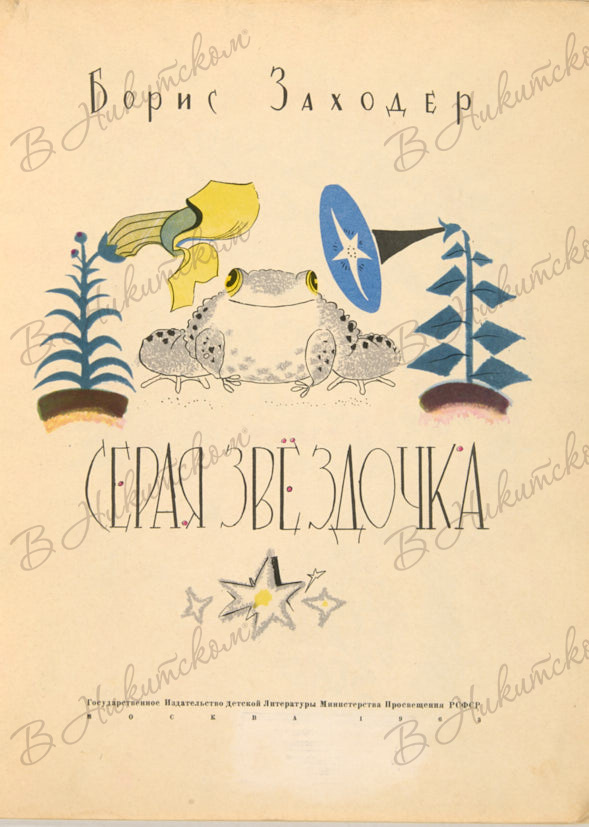 1. Заходер, Б. Серая звёздочка / рис. Л. Токмаков. М.: ДЕТГИЗ, 1963. 18, [2] с. 28,3 х 21,3 см. В иллюстрированной издательской обложке. Потертости обложки, незначительные загрязнения страниц, следы сгибов обложки и страниц.