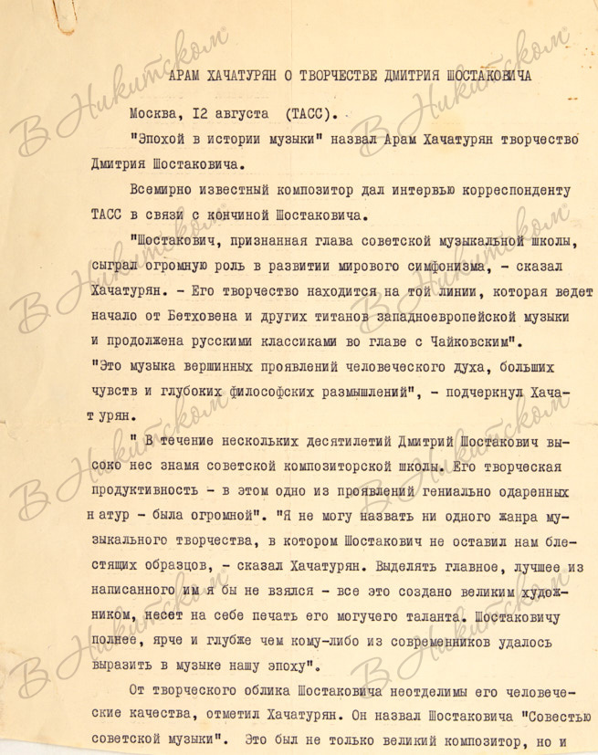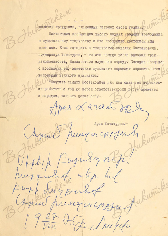 1. Хачатурян, А. [Автограф]. Автограф на армянском языке на машинописном черновике заметки о кончине Дмитрия Шостаковича. 1975. 2 л. 26,5 х 20,8 см; 30 х 20,8 см. Один из листов обрезан в нижней части.