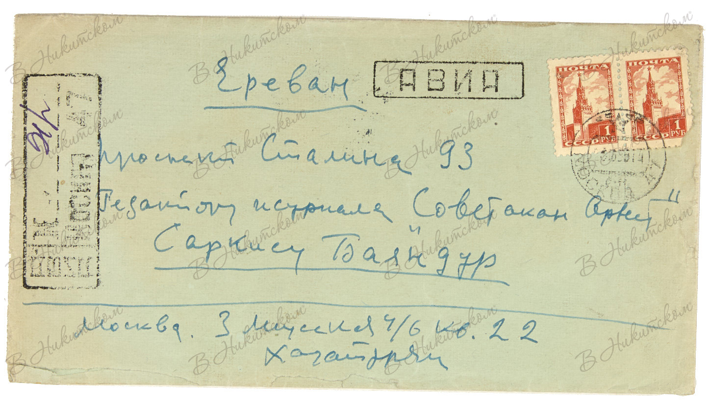 Адресат автографа - Саркис Багратович Баяндур (1911-2000), советский армянский искусствовед и драматург, кандидат искусствоведческих наук, Заслуженный артист Арм. ССР; в 1940-1941 и 1955 гг. был редактором журнала «Советакан Арвест» [Советское искусство], издававшегося в Ереване на армянском языке.
